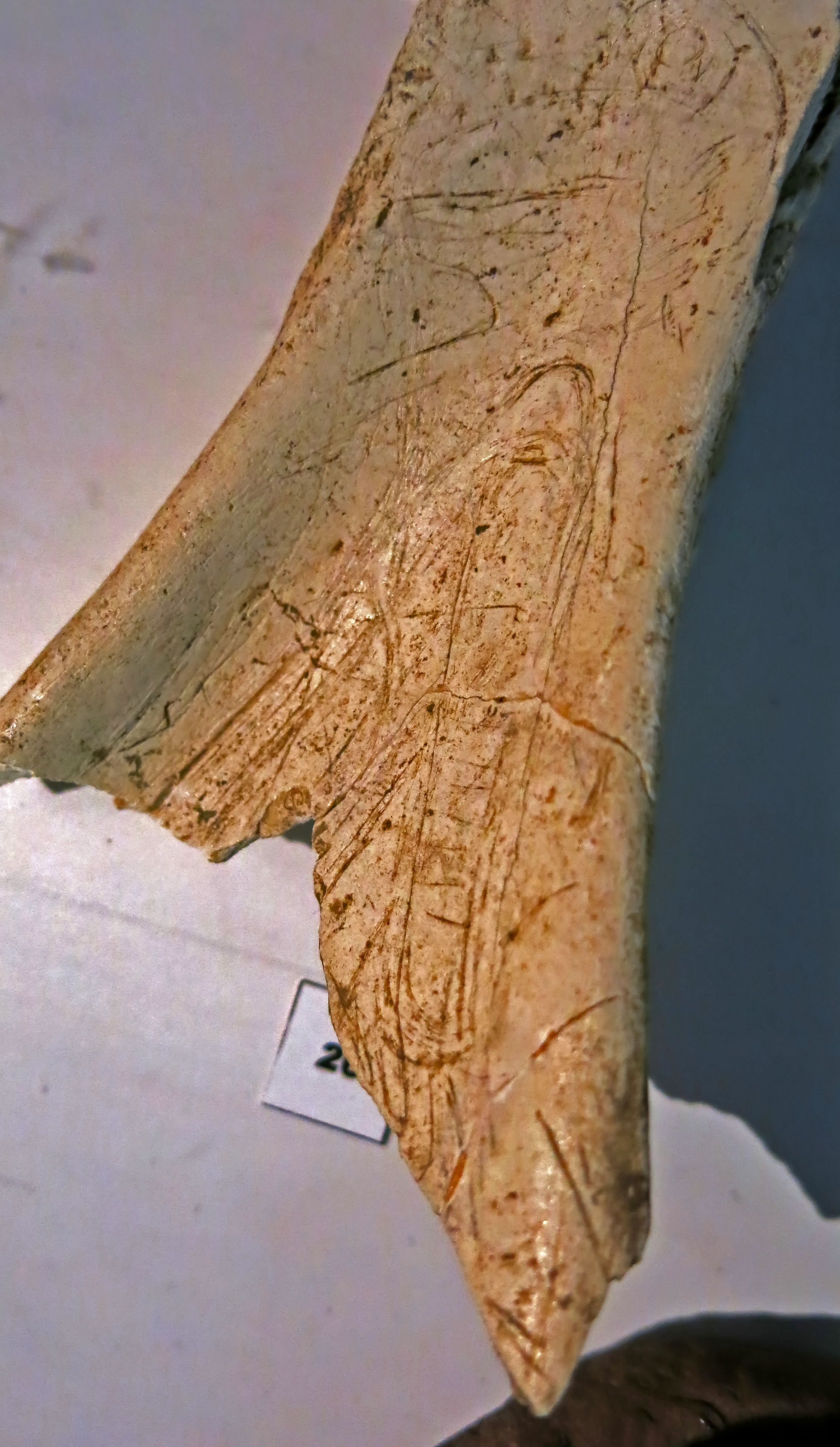 Two fragments of the same piece of bone. Length A 50 mm, length B 58 mm. These pieces are not connected, but obviously belong to the same object, as shown by the identity of the subject, technique and the style of the engravings.