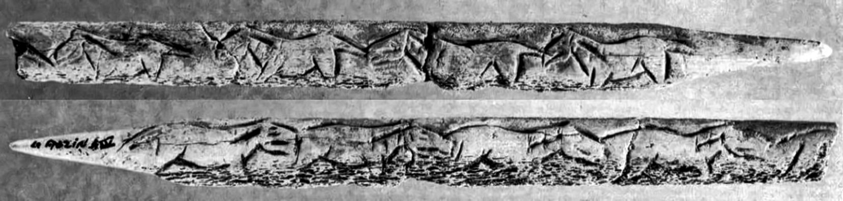 Their arrangement is reminiscent of a series of nested chevrons engraved on deer antlers, from Bruniquel, interpreted as a stylised triangular tail fin by H. Breuil and R. Saint-Perier.