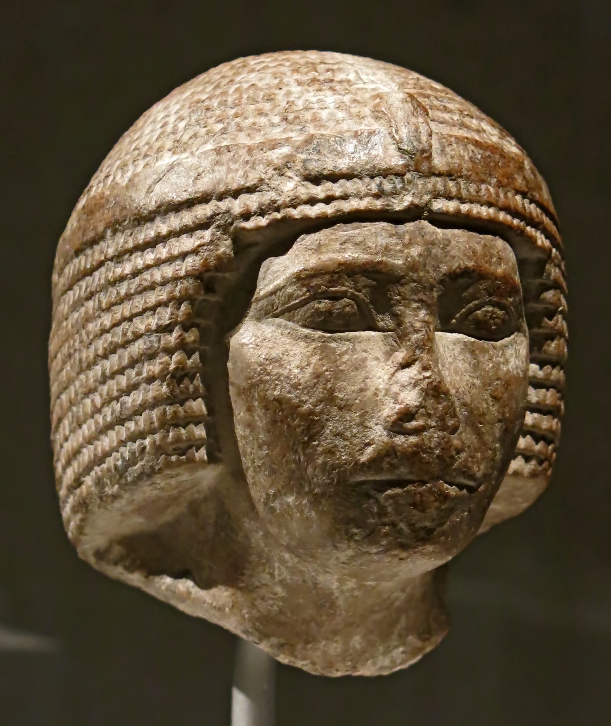 Head of a royal statue wearing a round wig with circlet and uraeus. Circa 2450 BC