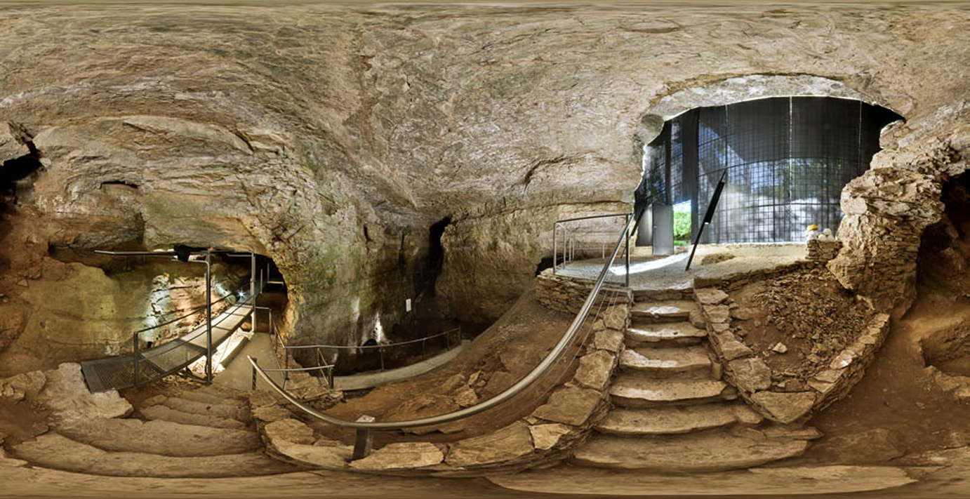 Carved into a limestone cliff, the entrance to the cave is 17 metres above the river level, with a wide porch giving access to a room 25 metres long and 10 wide at the entrance. It is itself extended to the right by two narrow galleries, and to the left by a more important gallery.