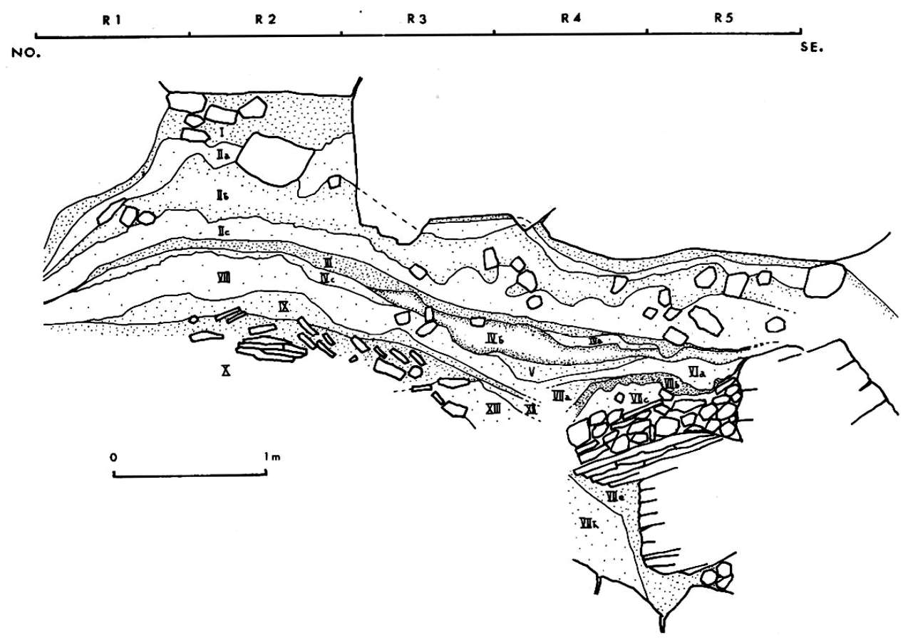 Post-Paleolithic levels have virtually disappeared. Discernible locally are two surface layers (1a and 1b) containing mixed industries of the Upper Palaeolithic and Post-Palaeolithic).