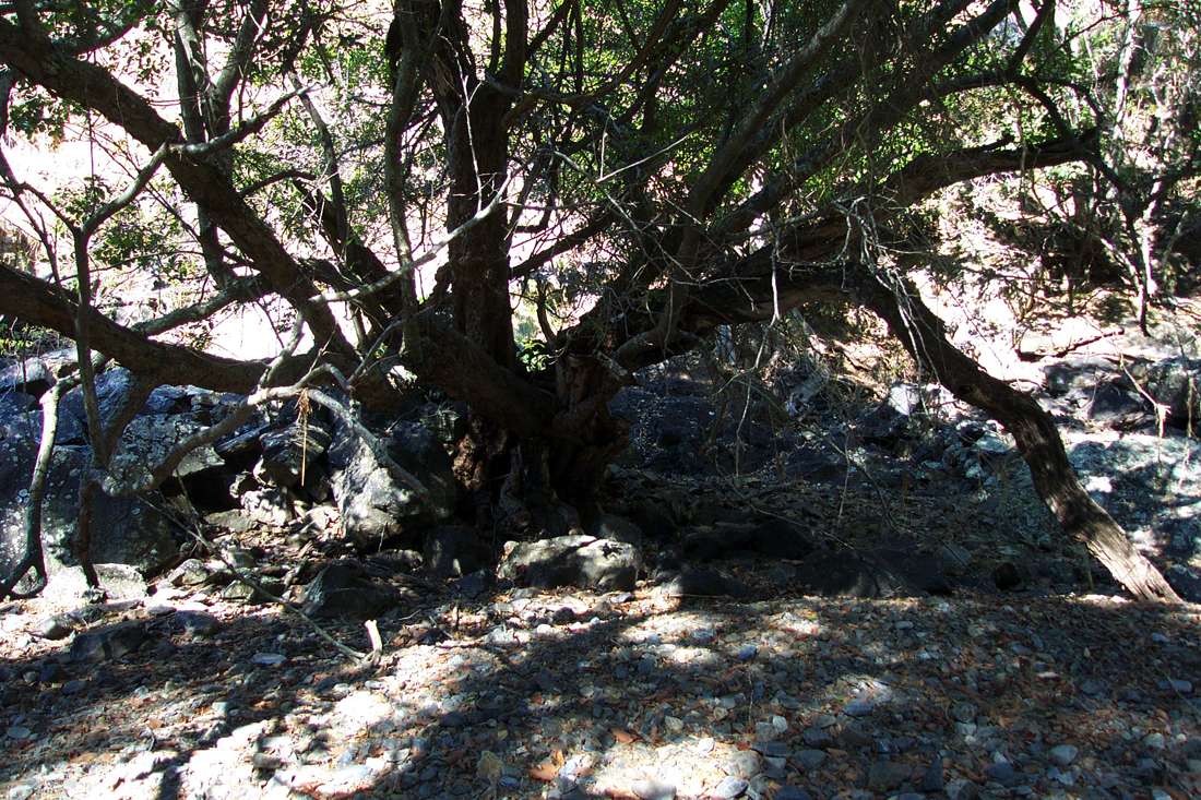 I traversed to the right, and found a rocky way down masked by the branches of a tree.