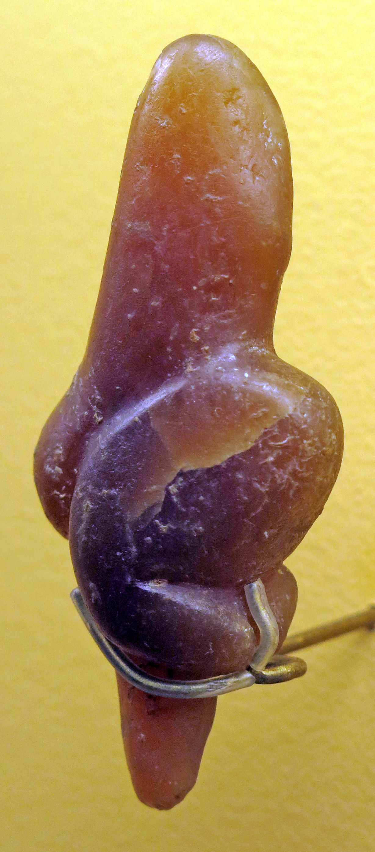 In 1959, at l'abri du Facteur, Tursac, Dordogne, H. Delporte (Delporte 1959, 1960, 1968)found a pebble of amber coloured calcite transformed into a female representation. This statuette (MAN 81693) is precisely dated to the Gravettian: