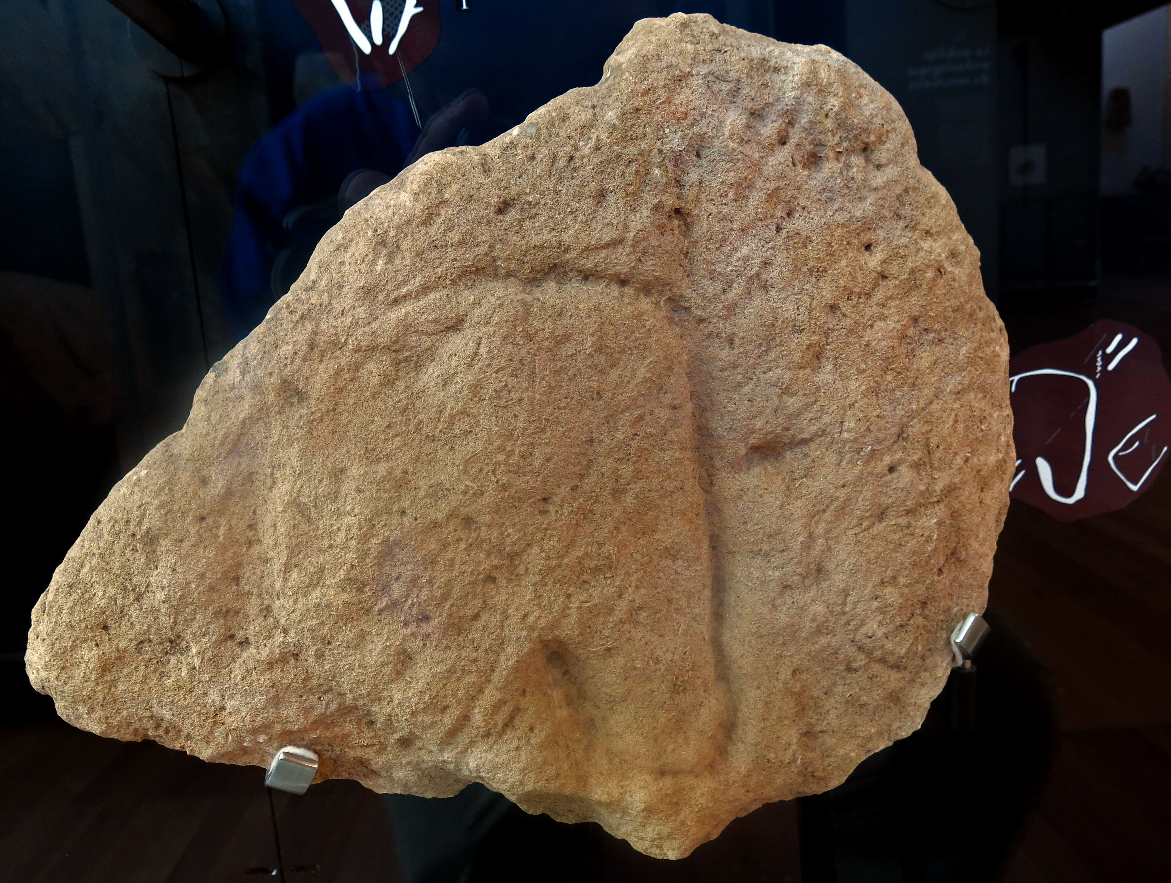 Engraved rock, with the legs of a four footed animal, as well as the outline of a vulva, and many cupules, from Ferrassie.