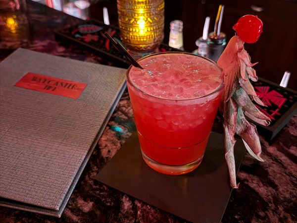 Each page held an image and a description of a single drink — some with the expected rum, some with gin, and some with tequila. There was even a giant shareable cocktail on the menu. Beer was available, as were nonalcoholic drinks.
