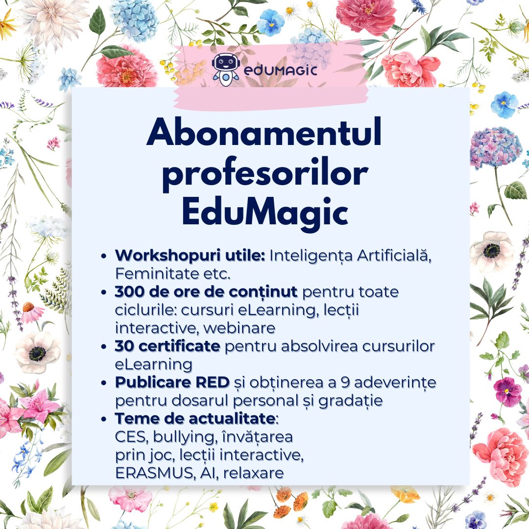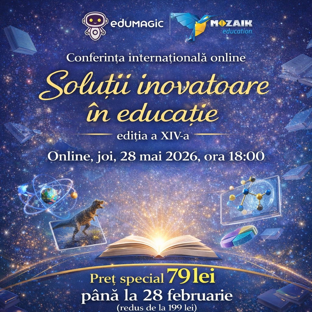 - Cursul în format eLearning: Inteligența Artificială pentru profesori: de la idee la resurse didactice gata de folositTe invităm online, vineri, 27 februarie, în intervalul orar 18:00-20:00 la atelierul AI pentru profesorii de la toate ciclurile de învățământ.Acest atelier te ajută să transformi Inteligența Artificială într-un asistent real de lucru: planificare, diferențiere, evaluare și creare de resurse digitale. Lucrăm cu exemple concrete și demonstrații live, folosind instrumente AI accesibile (chatbots și platforme de creare de conținut/lecții interactive), astfel încât să obții un set de idei inovatoare și cel puțin o resursă didactică adaptată propriului context. Discutăm și despre limitele AI și regulile de utilizare responsabilă (confidențialitate, verificare).Formator: Simona Ghenea este profesor pentru învățământ primar la Colegiul Național „Elena Cuza" din Craiova, profesor metodist, formator certificat, formator CCD Dolj în multiple ocazii, membru al Corpului Național al experților în management educațional, mentor de practică pedagogică. Pasionată de platformele digitale, Simona este ambasador Genially, eTwinning, Scientix, Quiver, Wakelet si Bookcreator.Diplomă: certificat de participare la atelierPreț atelier:59 lei (până la 20 februarie) redus de la 79 lei gratuit, dacă achiziționezi sau ai deja activ Abonamentul EduMagicSuport 0760676802 Luni-Vineri 9-17 (function(d, w, c) { w.BrevoConversationsID = '58d3ba0fbbddbd681f1ba478'; w[c] = w[c] || function() { (w[c].q = w[c].q || []).push(arguments); }; var s = d.createElement('script'); s.async = true; s.src = 'https://conversations-widget.brevo.com/brevo-conversations.js'; if (d.head) d.head.appendChild(s); })(document, window, 'BrevoConversations'); .mgz-element.x88f7phrswh1 .mgz-message-box{color:#011653;border-color:#fd7d53;background-color:rgba(255, 230, 219, 1);}.mgz-element.x88f7phrswh1 .mgz-message-box-icon,.mgz-element.x88f7phrswh1 .mgz-message-box-icon i{color:#011653;}79,00 leiVezi mai multe detalii >