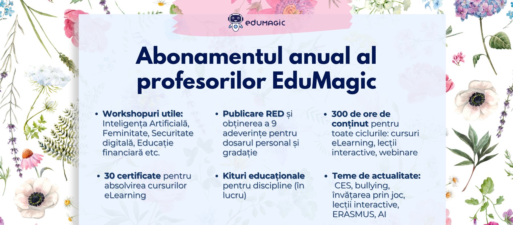 - Curs gratuit „Utilizarea platformei Eduboom de lecții video și teste în conformitate cu programa școlară”, 15 octombrie 2024La 15 octombrie lansăm Competiția Eduboom, care îți oferă șansa să utilizezi la clasă lecțiile video și testele captivante conforme cu programa școlară gratuit și să primești certificate valoroase pentru dosarul personal.Cei mai buni 10 profesori sunt invitaţi să prezinte live în simpozion experienţa lor, fiind premiaţi cu un abonament de 1 an la platforma Eduboom.Premiul cel mare este acordat primilor 3 profesori care, pe lângă 1 an de abonament la Eduboom pentru ei, primesc acces timp de 1 an pentru întreaga clasă!Pe lângă premiile Eduboom, dacă participi la toate activităţile competiţiei, atunci ai posibilitatea de a obţine până la 4 certificate valoroase pentru gradația de merit sau dosarul de evaluare anuală. Înscrie-te la competiția Eduboom - link Intră în comunitatea Eduboom - linkNu te descurci? Apeleaz-o pe Ana la 0760.676.802 (L-V, 9-17). .o8mcwemggwjw-s{background-color:#19ddba !important;} .mgz-element.o8mcwemggwjw .mgz-icon-list-item{margin-bottom:5px;}.mgz-element.o8mcwemggwjw .mgz-icon-list-item-icon{color:#333;}.mgz-element.o8mcwemggwjw .mgz-icon-list-item-icon:hover{color:rgba(26, 0, 255, 1);}.mgz-element.o8mcwemggwjw .mgz-icon-list-item-text{color:#333;}.mgz-element.o8mcwemggwjw .mgz-icon-list-item-text:hover{color:rgba(26, 0, 255, 1);} .mgz-element.nrlkyvlkl3om .mgz-message-box{color:#5e7f96;border-color:#cfebfe;background-color:#e6fdf8;}.mgz-element.nrlkyvlkl3om .mgz-message-box-icon,.mgz-element.nrlkyvlkl3om .mgz-message-box-icon i{color:#1bbc9b;}0,00 leiVezi Cursul Vezi mai multe detalii >