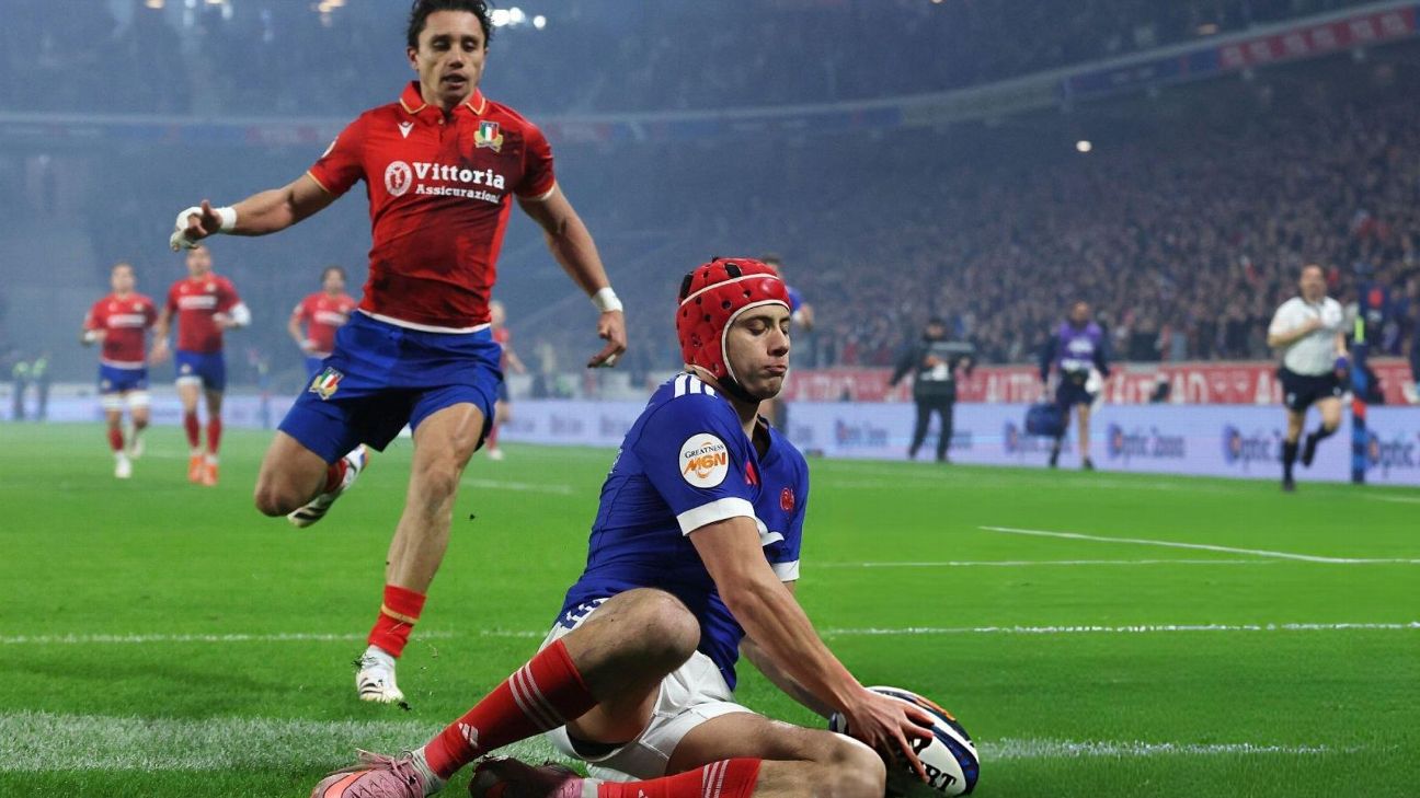 El joven maravilla francés aprovechó un gran kick de Antoine Dupont para ganar en velocidad y apoyar en el ingoal de Italia.
