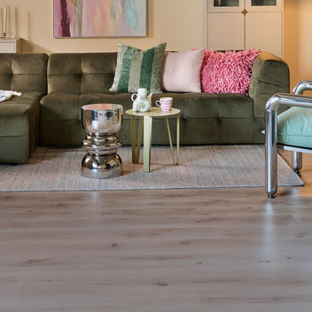 Een kleurencombinatie die werkt: een warme linen-neutrale basis, diep mosgroen, mintgroen, bubblegum en glanzend zilveren accenten. Samen zorgen deze tinten voor een woonkamer die rustig oogt, maar toch...