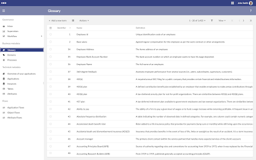 • Erstellen, verwalten und verteilen Sie operative Daten in einer intuitiven und Self-Service-Umgebung an alle Geschäftsteams. Anzeigen, suchen, erstellen, bearbeiten und genehmigen Sie Änderungen.