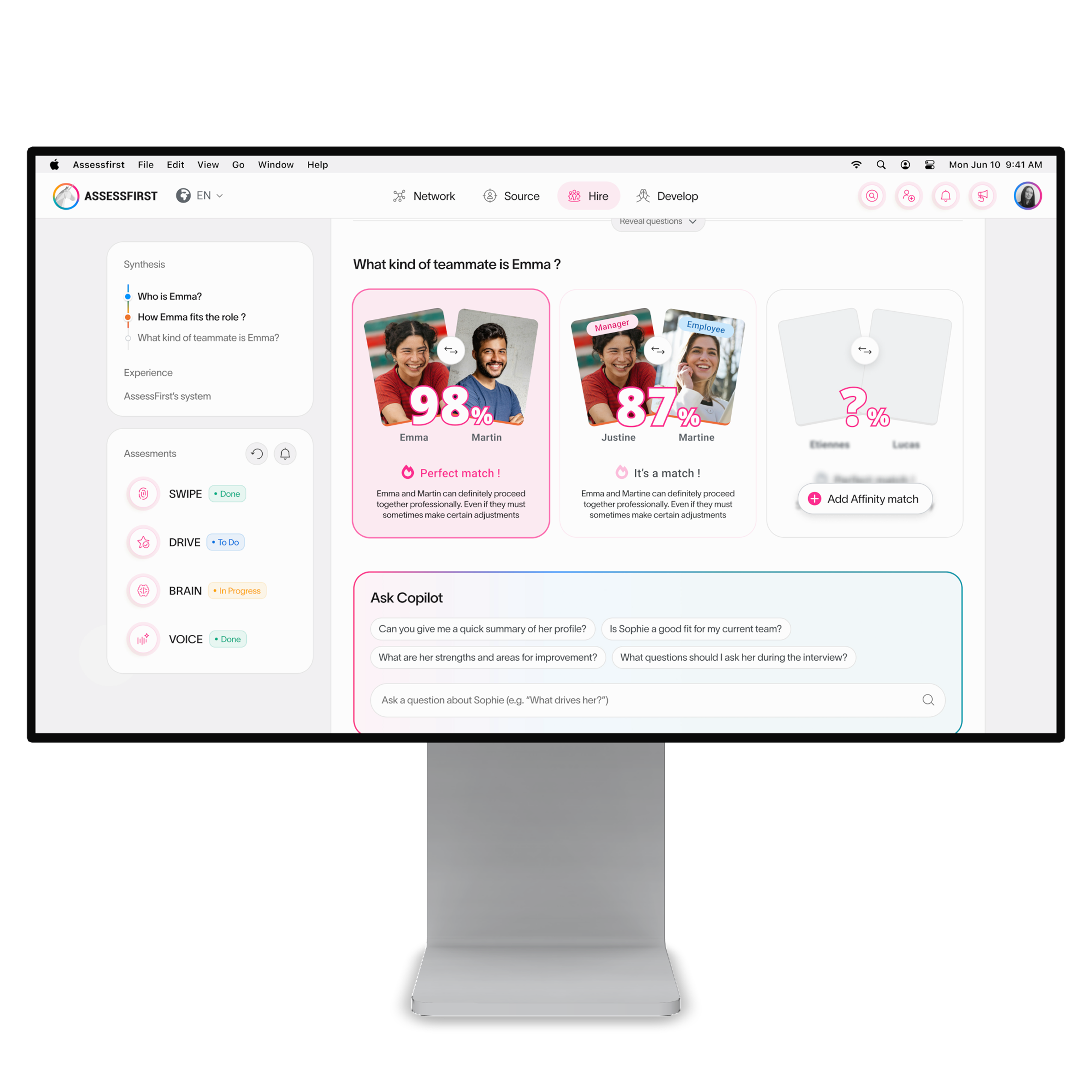En un mundo donde las organizaciones deben contratar más rápido, de manera más inteligente e inclusiva, AssessFirst ofrece un nuevo estándar para la toma de decisiones de talento, combinando ciencia profunda, IA avanzada y una experiencia de usuario de clase mundial.