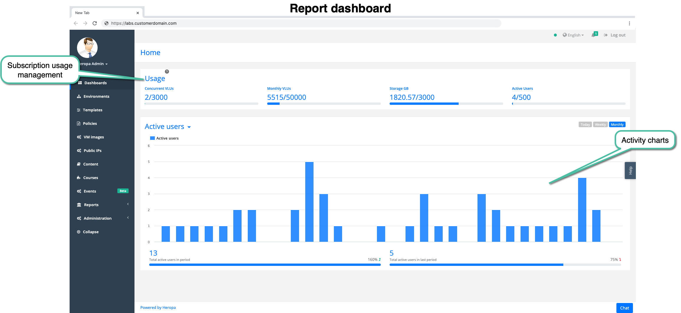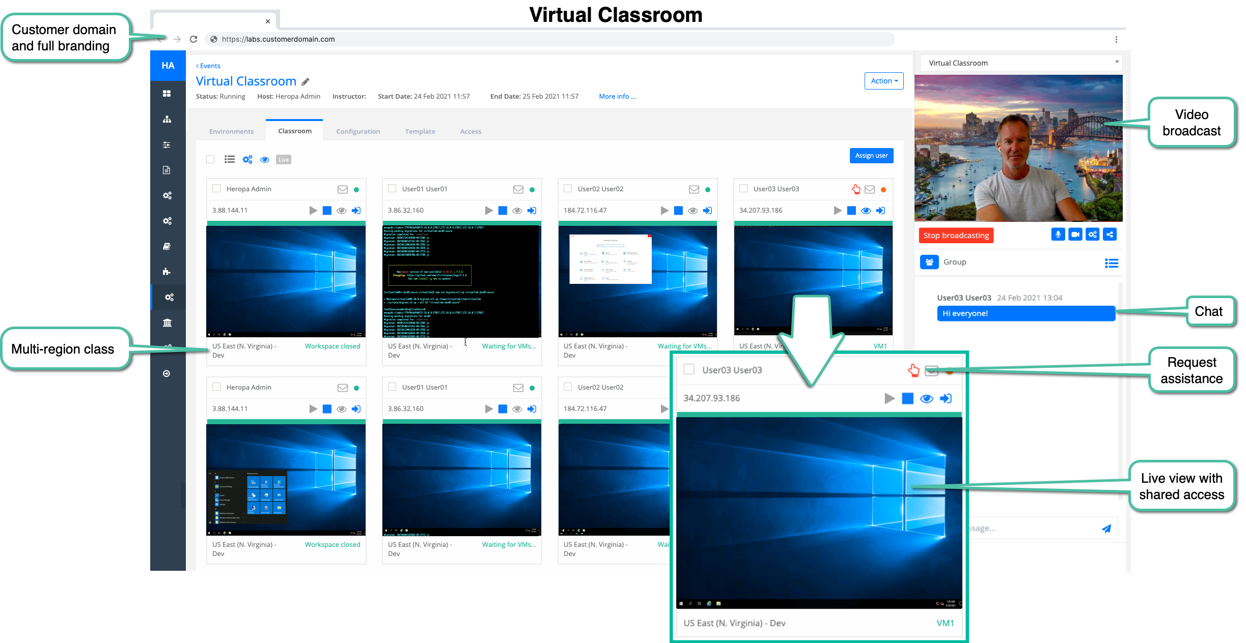 3. Consola de administración eficiente En el backend, Heropa ofrece una consola de administración que es un cambio de juego para los administradores encargados de construir entornos de laboratorio. La consola no se trata solo de control; se trata de eficiencia optimizada para facilitar la implementación. Permite a nuestro equipo gestionar y monitorear las actividades de laboratorio con facilidad, asegurando que todo funcione sin problemas detrás de escena.