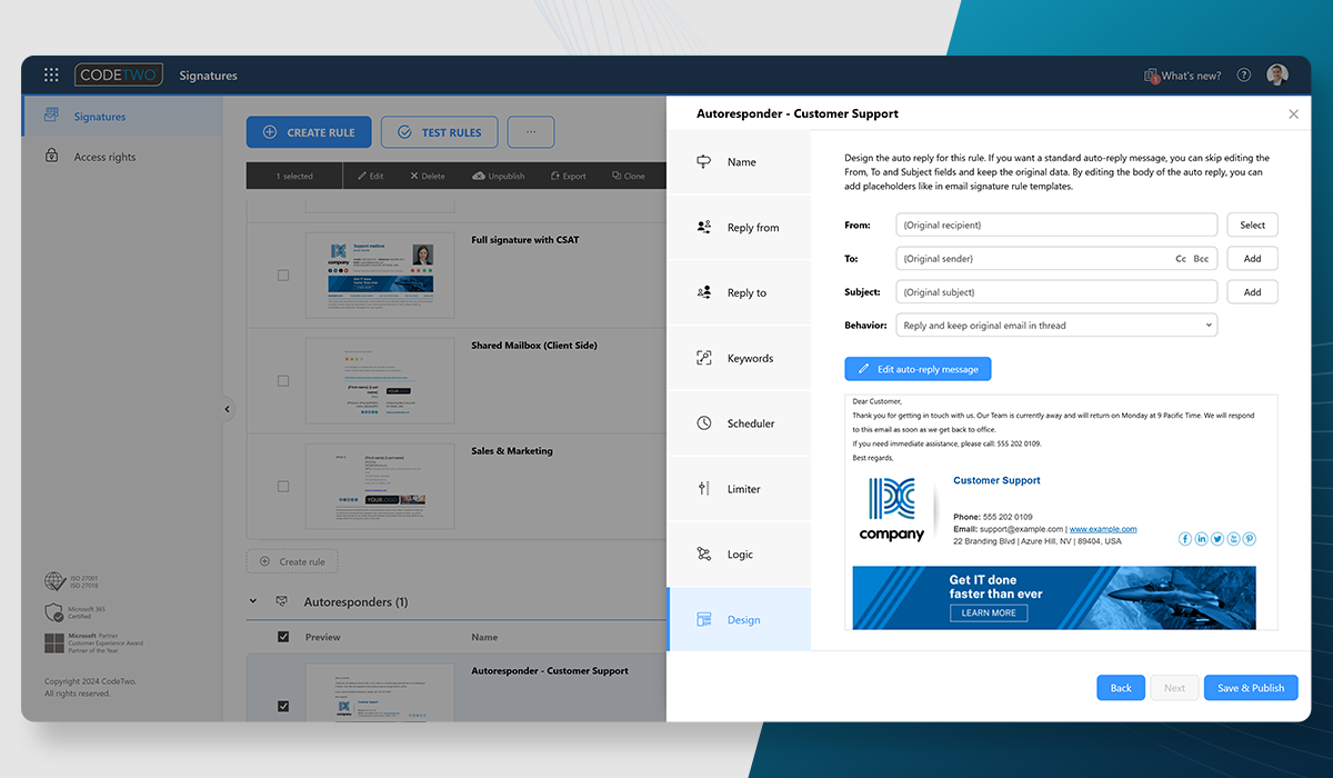 Ce que j'aime le plus à propos de CodeTwo Email Signatures 365, c'est le niveau de contrôle centralisé et de cohérence qu'il offre à travers l'ensemble de notre locataire Microsoft 365. En tant que responsable informatique, pouvoir gérer et déployer des signatures d'email à l'échelle de l'entreprise sans dépendre des utilisateurs finaux pour configurer quoi que ce soit localement est un avantage majeur.