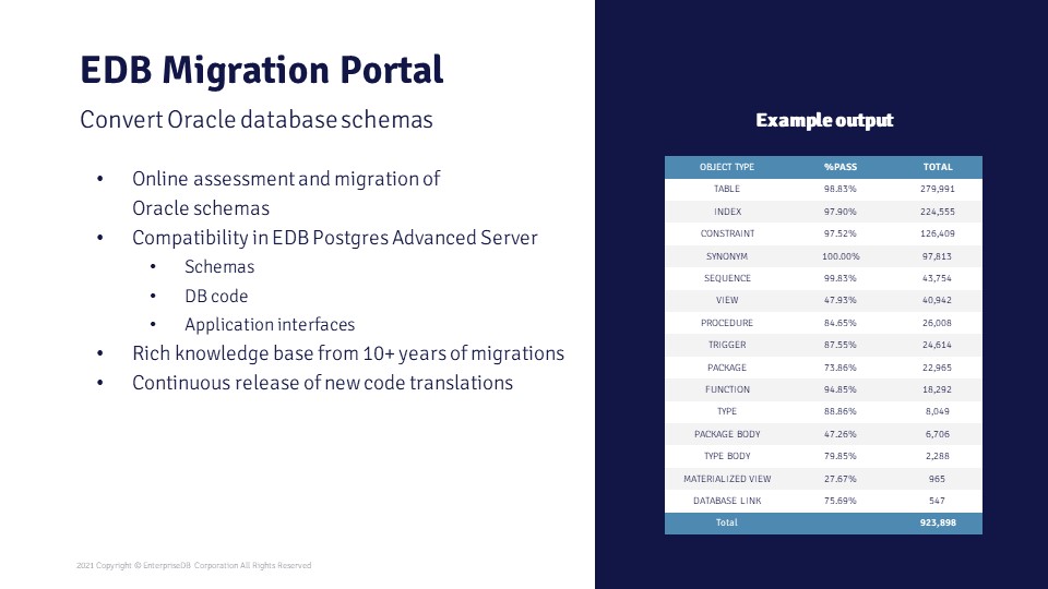 J'apprécie la compatibilité Oracle qu'offre EDB Postgres Advanced Server, qui est cruciale pour fournir des solutions Postgres compatibles avec Oracle à nos clients. La suite d'outils EDB est complète et bien soutenue, ce qui améliore la valeur globale du service. Les outils de migration d'EDB facilitent considérablement la migration des données et des DDL d'Oracle vers Postgres, rationalisant notre flux de travail et réduisant les défis potentiels de transition. Le support fourni par EDB est excellent et a été essentiel pour assurer une transition en douceur et un fonctionnement continu. Je trouve le processus d'installation simple et j'apprécie grandement la documentation disponible, qui a rendu la courbe d'apprentissage du passage d'Oracle beaucoup plus gérable. La suite d'outils disponible correspond bien à nos besoins et aide à accélérer notre capacité à proposer Postgres comme solution de base de données alternative. Dans l'ensemble, le support d'EDB et les outils fournis contribuent grandement à la facilité d'utilisation et à la fiabilité d'EDB Postgres Advanced Server. Avis collecté par et hébergé sur G2.com.