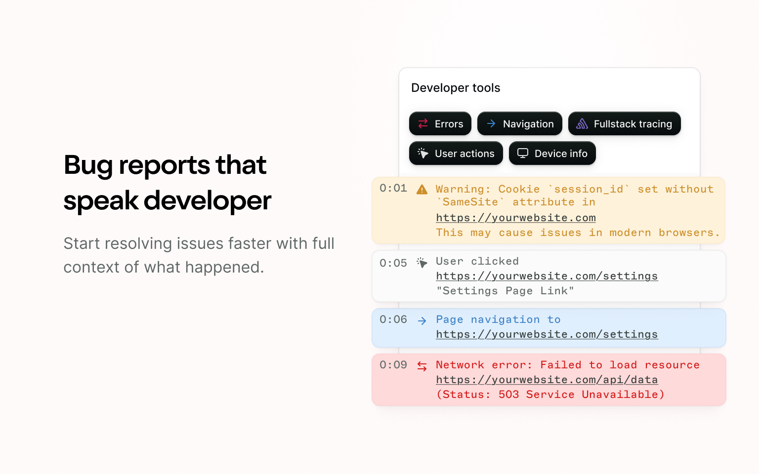 Jam capture automatiquement les journaux de console, les actions des utilisateurs, les erreurs réseau et les informations sur l'appareil pour que les développeurs puissent commencer à résoudre les problèmes plus rapidement avec le contexte complet de ce qui s'est passé.