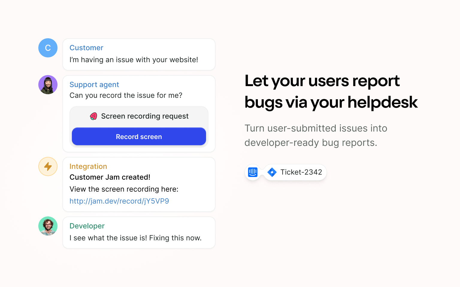 Des testeurs QA aux agents de support, tout le monde peut créer des rapports de bugs prêts pour les développeurs avec Jam.