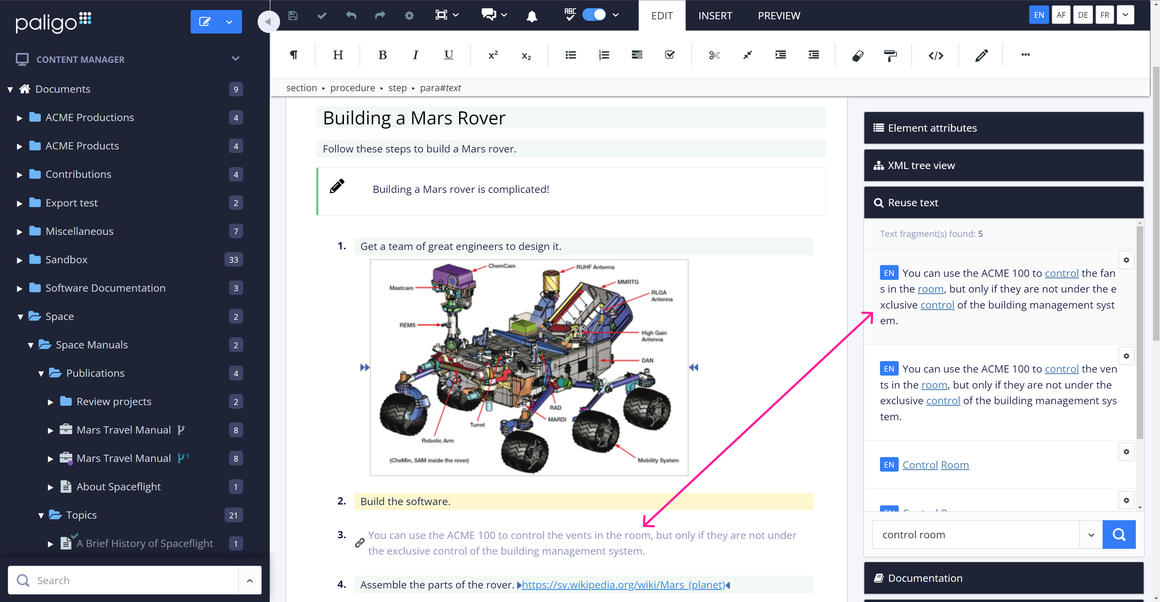 En commençant à utiliser Paligo, vous verrez sa véritable puissance, qui est la réutilisation complète et véritable du contenu. Paligo attribue à chaque élément un identifiant unique, et vous pouvez référencer cet identifiant n'importe où. Le meilleur de tout, c'est que vous pouvez utiliser les outils de l'interface utilisateur pour réutiliser le contenu, ce qui signifie que vous n'avez pas à entrer les longs identifiants uniques dans le code DocBook.