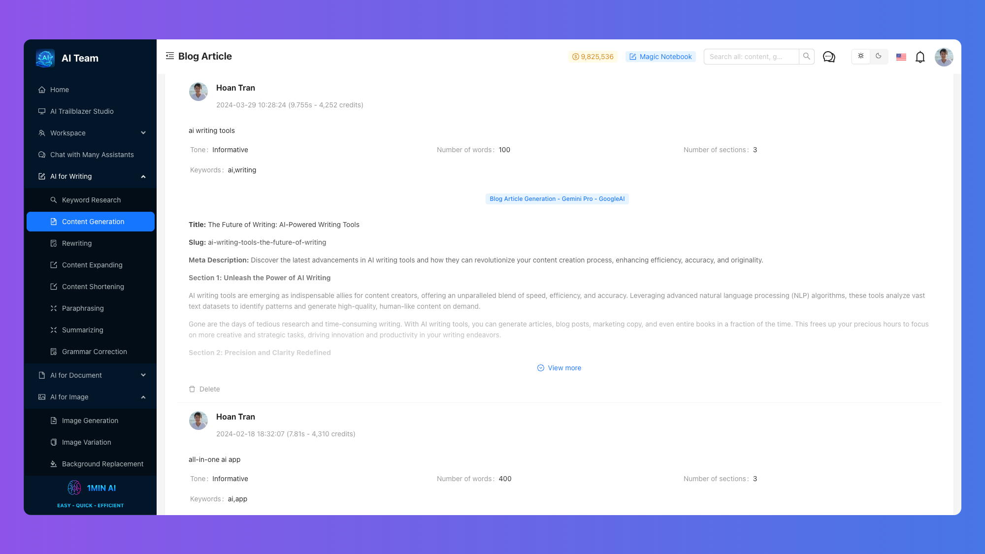 J'apprécie vraiment la façon dont 1min.AI peut rapidement réduire le temps nécessaire pour produire du contenu de qualité. C'est très pratique pour résumer rapidement des documents longs ou même pour susciter de nouvelles idées. De plus, c'est intuitif et facile à utiliser, ce qui en fait un outil incontournable lorsque j'ai besoin d'efficacité et de créativité combinées. Avis collecté par et hébergé sur G2.com.