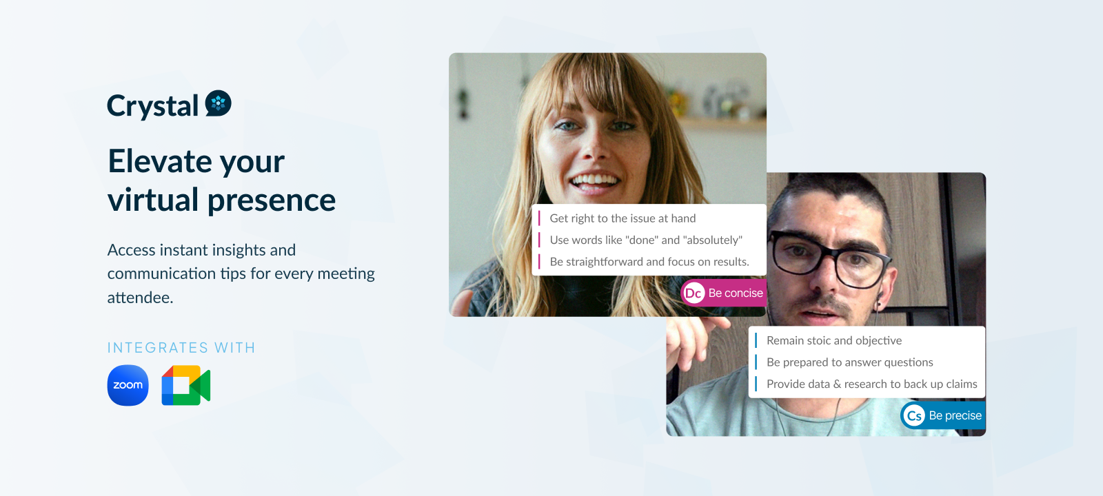 Individui in diverse funzioni utilizzano Crystal per prepararsi a riunioni individuali, collaborazioni interfunzionali, presentazioni e interazioni con i clienti. La piattaforma supporta i professionisti che vogliono migliorare le competenze comunicative e ridurre le congetture in contesti interpersonali.