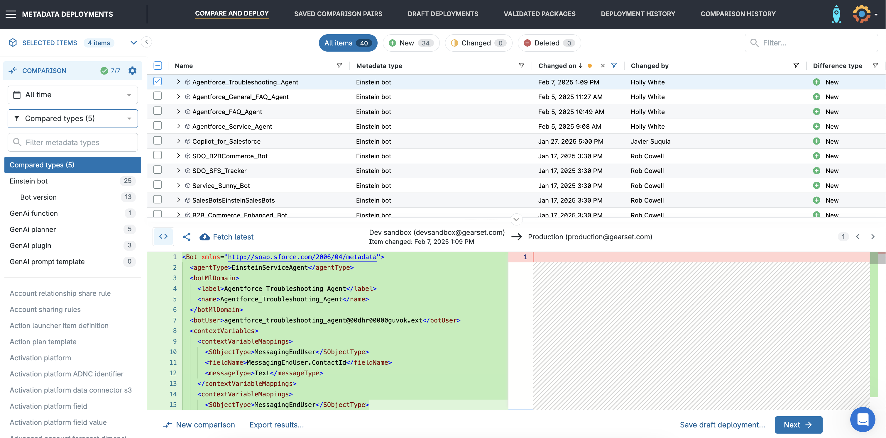 La piattaforma supporta una vasta gamma di casi d'uso Salesforce, inclusi distribuzioni di metadata e CPQ, automazione CI/CD, flussi di lavoro di revisione del codice, semina di sandbox, automazione dei test e monitoraggio. Oltre all'automazione delle distribuzioni, Gearset include strumenti per la protezione dei dati Salesforce e la gestione a lungo termine dei dati, come backup automatici, ripristino dei dati e archiviazione. Le funzionalità di osservabilità e Org Intelligence forniscono informazioni sulla salute dell'org, sul rischio di distribuzione e sui cambiamenti del sistema nel tempo.