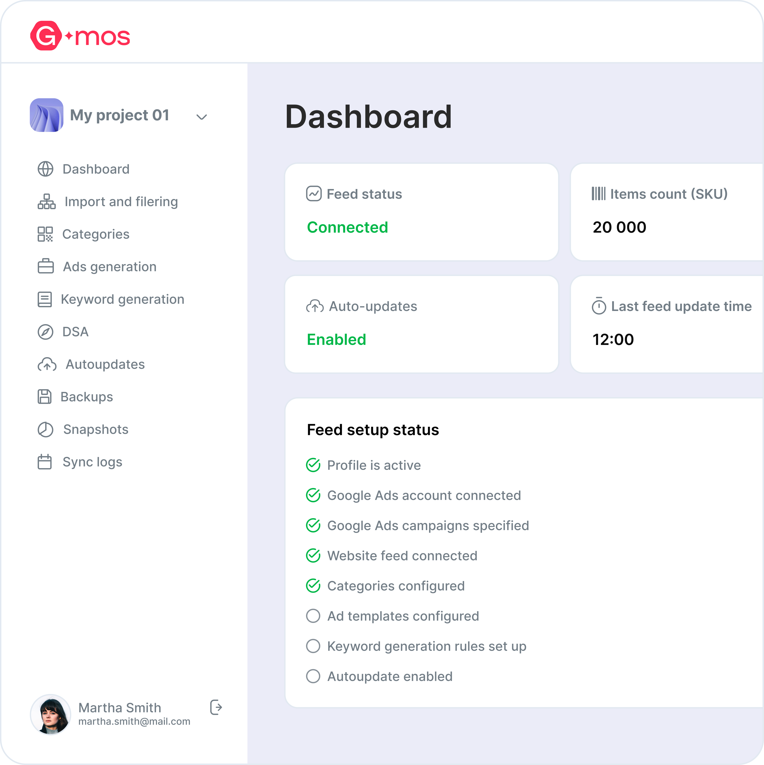 G-MOS é uma plataforma de automação PPC criada para ajudar empresas a lançar, gerenciar e otimizar campanhas do Google Ads (Google Adwords) em escala com esforço manual mínimo. A plataforma automatiza todo o ciclo de vida das campanhas de Pesquisa - desde a criação de anúncios até a otimização contínua de anúncios - usando dados estruturados de produtos e sinais de desempenho em tempo real.