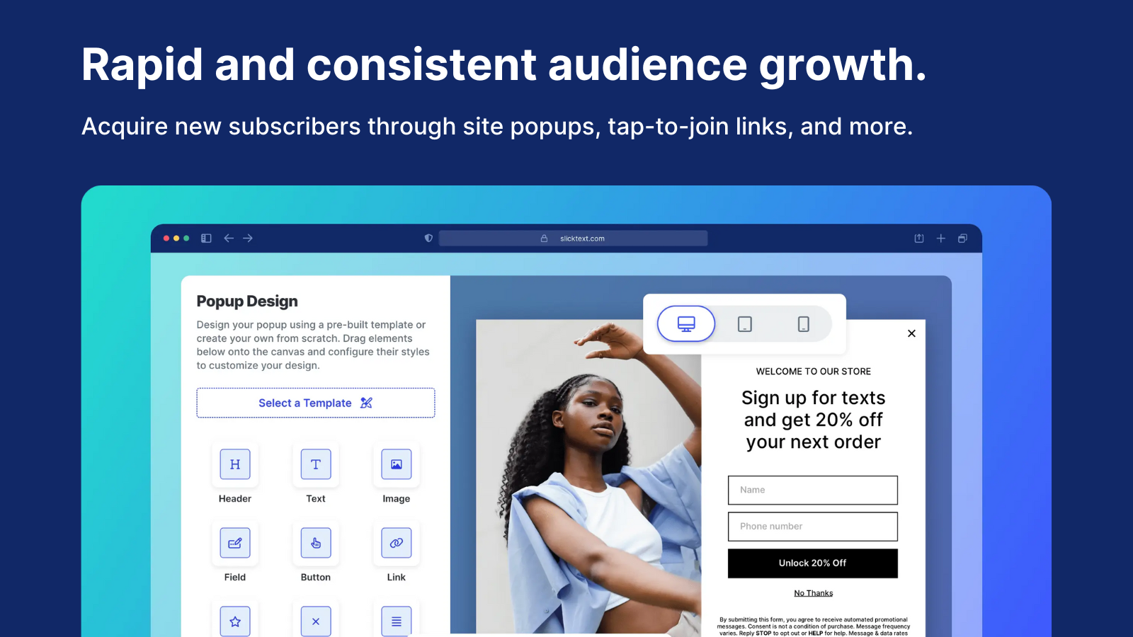 Acquire new subscribers through site popups, tap-to-join links, and more.