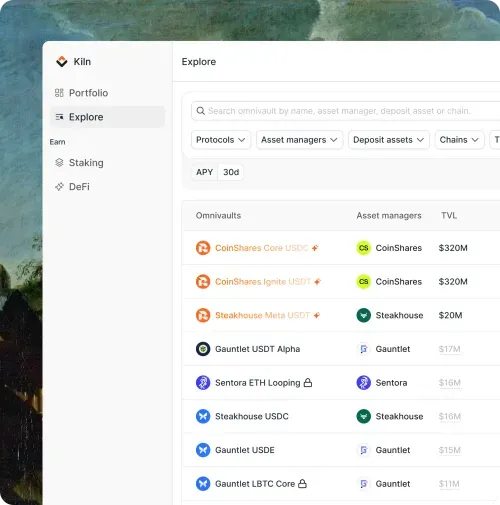 Funds use Kiln to access and monitor yield across assets and strategies within an institutional framework. Platforms use Kiln to integrate yield capabilities for their users without building complex onchain infrastructure internally.