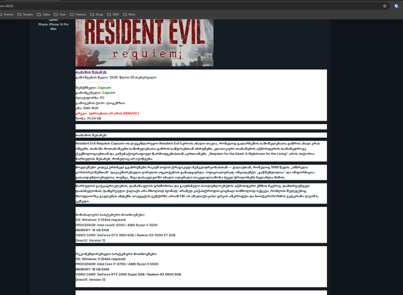 https://store.steampowered.com/app/3764200/Resident_Evil_Requiem/ თამაშის შესახებ: გამოშვების წელი: 2026 წლის 26 თებერვალი ჟანრი: Survival horror შემქმნელი: Capcom გამომცემელი: Capcom პლატფორმა: PC გამოცემის ტიპი: ლიცენზია ენა: ENG-RUS კრეკი: (დროებით არ არის DENUVO ) ზომა: 74.04 GB თამაშის შესახებ: Resident Evil Requiem Capcom-ის ლეგენდარული Resident Evil სერიის ახალი თავია, რომელიც გადარჩენის საშინელებათა ჟანრის ახალ ერას იწყებს. თამაში მოთამაშეებს საშინელებათა ჟანრის საწყისებთან აბრუნებს, კლასიკური თამაშების ატმოსფეროს თანამედროვე ტექნოლოგიებთან და კინემატოგრაფიულ წარმოდგენასთან აერთიანებს. „Requiem for the Dead: A Nightmare for the Living“ არის ისტორია წარსულის შესახებ, რომელიც არ ივიწყება. მოვლენები კიდევ ერთხელ გვაბრუნებს რაკუნ სიტის ტრაგიკულ მემკვიდრეობასთან — ქალაქთან, რომელიც 1998 წელს „ამბრელა კორპორეიშენთან“ დაკავშირებული ვირუსის აფეთქებით განადგურდა. ოფიციალურად, ინციდენტი „გაწმენდილია“ და ინფორმაცია გასაიდუმლოებულია. თუმცა, შუა დასავლეთში ახალი იდუმალი სიკვდილიანობა ძველ ჭრილობებს ხელახლა ხსნის. წარსულის გაუკაცრიელების, დანაშაულის გრძნობისა და გაუხსნელი საიდუმლოებების ატმოსფერო ქმნის მკვრივ, დამთრგუნველ დაძაბულობას. დანგრეული ქალაქი არა მხოლოდ ფონად, არამედ კატასტროფის ცოცხალ სიმბოლოდ იქცევა, რომლის შედეგებიც მსოფლიოზე გავლენას ახდენს. სიუჟეტის ცენტრში არიან FBI-ის ანალიტიკოსი გრეის აშკროფტი და ბიოტერორიზმის ვეტერანი ლეონ ს. კენედი. მინიმალური სისტემური მოთხოვნები: OS: Windows 11 (64bit required) PROCESSOR: Intel corei5-8500 / AMD Ryzen 5 3500 MEMORY: 16 GB RAM VIDEO CARD: GeForce GTX 1660 6GB / Radeon RX 5500 XT 8GB DirectX: Version 12 რეკომენდირებული სისტემური მოთხოვნები: OS: Windows 11 (64bit required) PROCESSOR: Intel Core i7-8700 / AMD Ryzen 5 5500 MEMORY: 16 GB RAM VIDEO CARD: GeForce RTX 2060 Super 8GB / Radeon RX 6600 8GB DirectX: Version 12