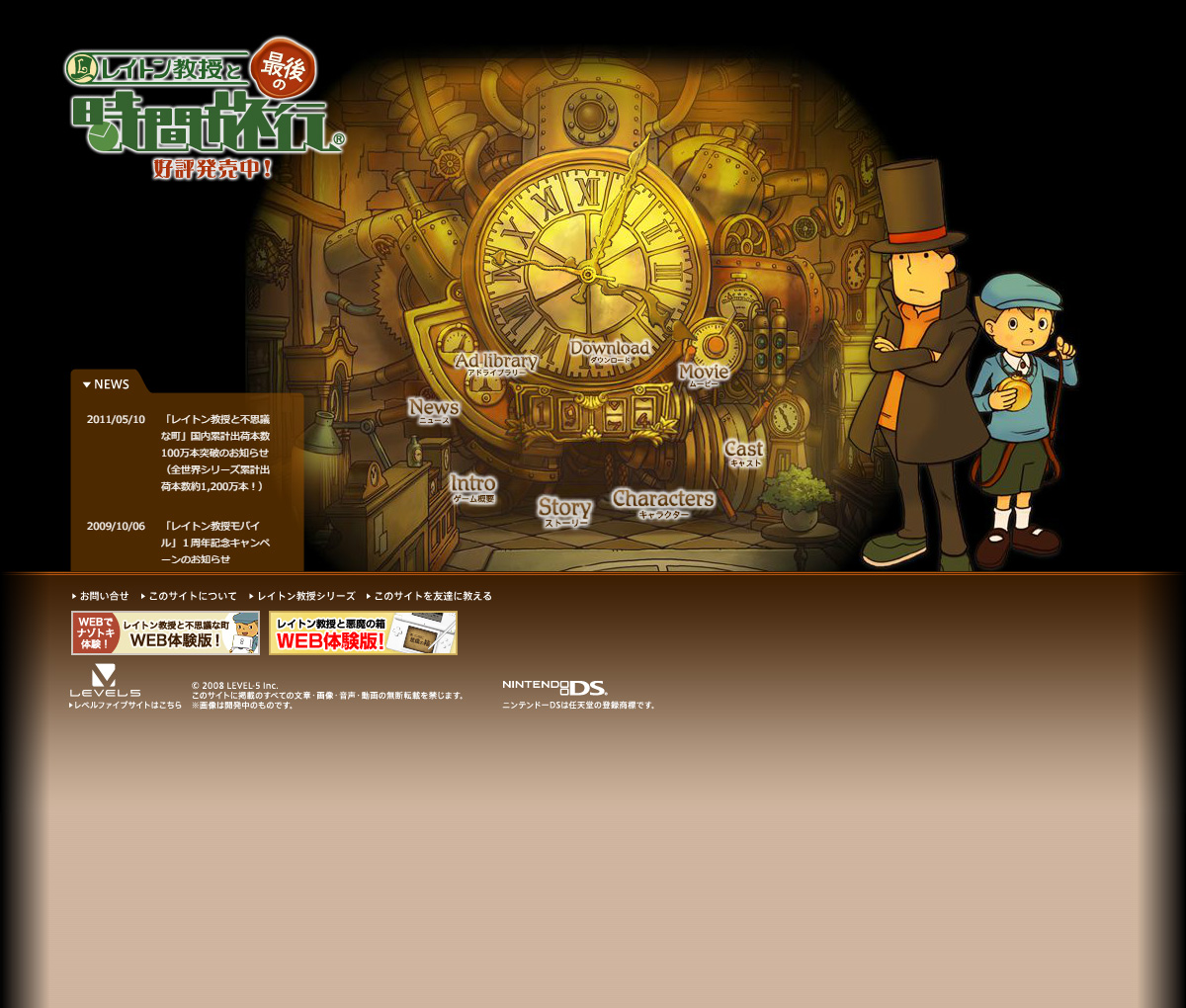 ニュース ゲーム概要 ストーリー キャラクター キャスト ムービー ダウンロード アドライブラリー ニュース お問い合せ このサイトについて レイトン教授シリーズ このサイトを友達に教える レイトン教授と不思議な町WEB体験版 レイトン教授と悪魔の箱WEB体験版 レベルファイブサイトはこちら