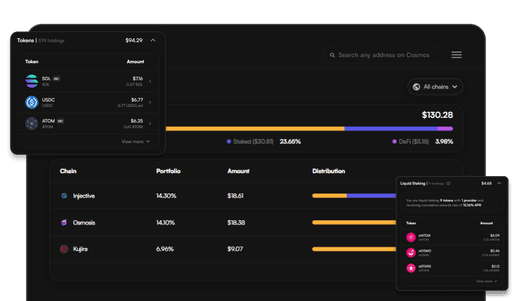 Explore all your tokens, DeFi positions, staked assets & more across all Cosmos chains.