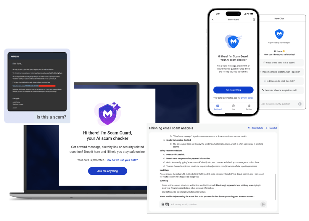 Get 24/7 real-time scam advice with lightning-fast, AI-powered responses, backed by the experts at Malwarebytes.