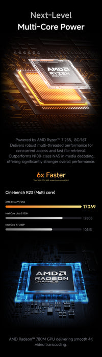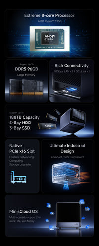 내장 기능으로는 ZFS 스냅샷, LZ4 압축, 다중 사용자 격리, 도커 앱, 인공지능 사진 앨범, 원클릭 원격 접속 등이 포함되어 있어 완전하게 관리되며 즉시 사용할 준비가 되어 있습니다.