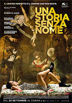 “Una Storia Senza Nome” del regista Roberto Andò è il titolo che viene dato al copione di un film in cui vengono narrati gli eventi che ruotano intorno al furto (realmente accaduto nel 1969) di un dipinto del Caravaggio in una Chiesa a Palermo da parte della Mafia locale e poi misteriosamente scomparso. Colui, anzi colei, che scrive tali copioni cinematografici di successo è in realtà la segretaria (Micaela Ramazzotti) di una casa di produzione la quale, in pratica, si sostituisce , senza però firmarsi, al vero sceneggiatore (Alessandro Gassman), da tempo in crisi creativa. Essendo la donna stata avvicinata da un misterioso signore anziano (la cui identità verrà svelata alla fine) che le ha rivelato il caso del suddetto furto e tutte le possibili sorti legate al famoso quadro scomparso, ella si trova coinvolta nella questione in prima persona, vivendo tutte le avventure che concernono tale vicenda misteriosa.