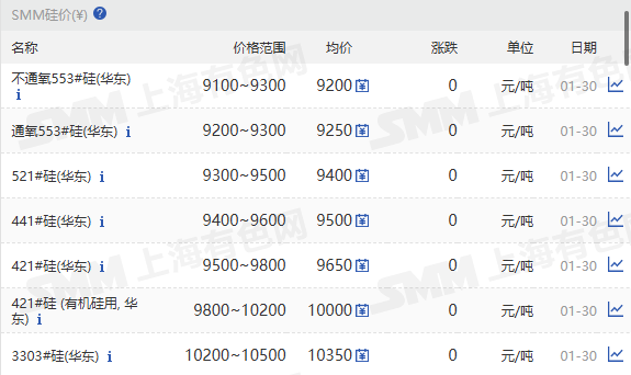 1月30日多地工业硅及97硅价格持稳【SMM华东工业硅价格持稳】1月30日,SMM华东不通氧553#在9100-9300元/吨;通氧553#在9200-9300元/吨;521#在9300-9500元/吨;441#在9400-9600元/吨;421#在9500-9800元/吨;421#有机硅用在9800-10200元/吨;3303#在10200-10500元/吨。黄埔港、天津、上海、新疆、四川、西北地区硅价持稳。97硅今日价格持稳。