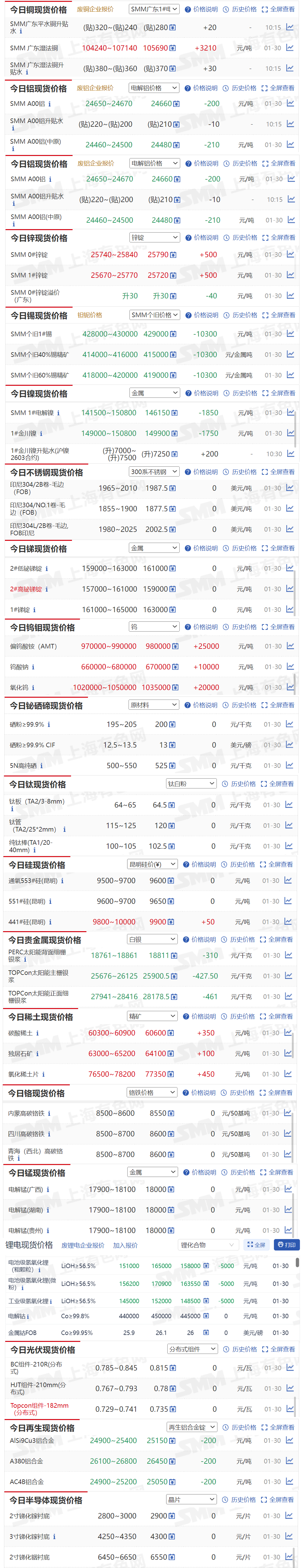 【1月30日SMM金属现货价格|铜价|铝价|铅价|锌价|锡价|镍价|钢铁|废金属|稀土|小金属|新能源|光伏】【1月30日SMM金属现货价格|铜价|铝价|铅价|锌价|锡价|镍价|钢铁|废金属|稀土|小金属|新能源|光伏】今日,SMM个旧1#锡现货报价下跌10300元/吨,偏钨酸铵(AMT)现货报价上涨25000元/吨...其余金属现货报价情况如下.... (详情)