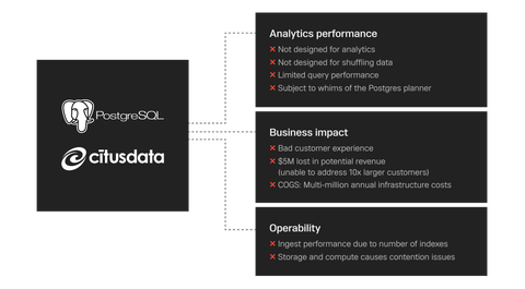 Heap was built on PostgreSQL with a CitusData layer on top of it to provide distributed PostgreSQL, but the team ran into problems with its legacy architecture because Postgres and Citus are designed to serve as transactional databases, whereas Heap’s core value is providing rapid analytical insights to its customers. The team worked around this with indexing strategies, but faced technical and business limitations for which there were no real workarounds: