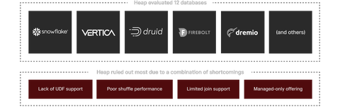 Heap undertook an extremely thorough evaluation of a dozen databases including Dremio, Druid, Firebolt, Snowflake and Vertica. A number of them were knocked out immediately because like PostgreSQL, they couple compute and storage. “Others solely offer a managed service,” said Shelestak, and Heap needs to be able to host its own solutions. Some fell short because they cannot support performant shuffle operations; others because they offer no UDF support.