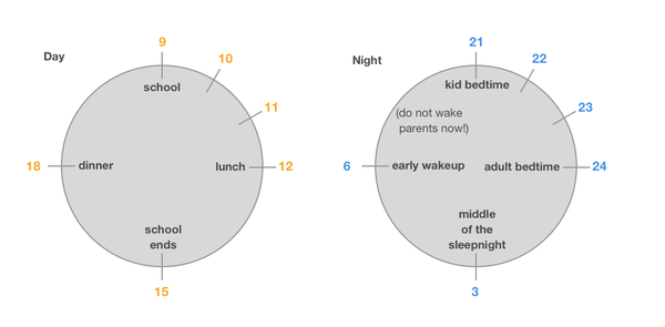 But the day does not begin at noon, and the night does not begin at midnight. For a child whose day begins at school at 9 and goes to bed at 21, this might make more sense: