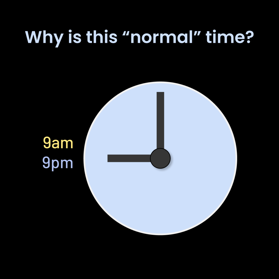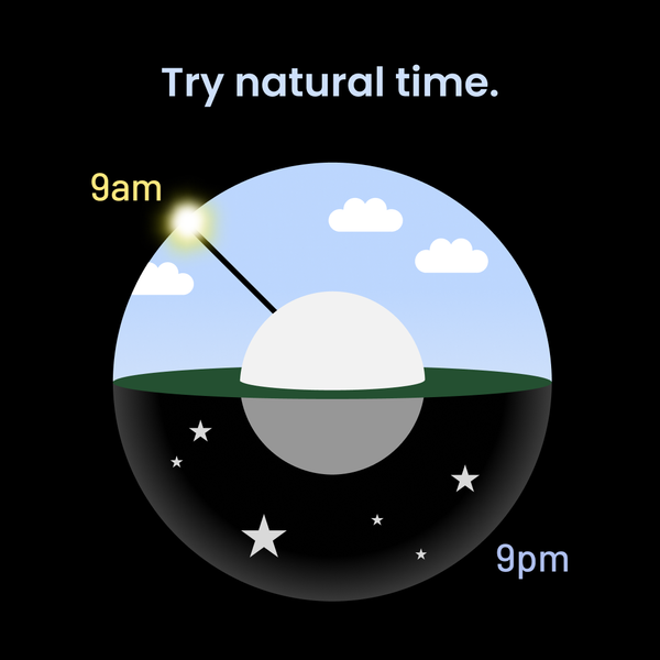 "Normal time" makes you internalize the idea that it's okay for nine in the morning and nine at night to look identical. Why must it be like this? I suspect this is one of the factors that makes time blindness in neurodiverse people (like those with ADHD) worse than it needs to be. You are forced to interpret time not only in terms of two arrows pointing in two directions on two entirely different scales, but each combined arrow shape corresponds to two different times of day. Of course you know which one is which right now based on whether it's day or night. However, in terms of remembering what time something is, it ends up more a visual representation of a number than the concept of that particular time itself.