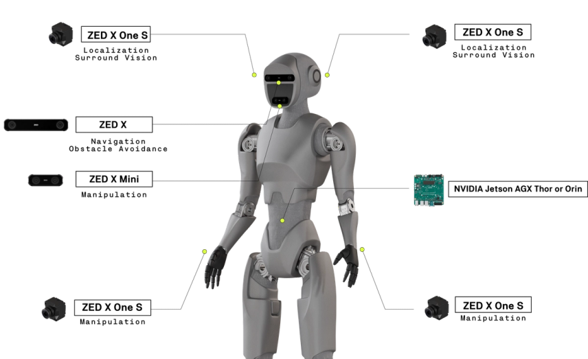 Ultra-compact ZED cameras integrate seamlessly across a humanoid robot’s head and body, delivering continuous awareness. Combined with other onboard sensors, they provide precise close-range depth and fisheye coverage for locomotion, manipulation, grasping, and fine-motor tasks. This real-time vision allows humanoids to sense, plan, and act intelligently in dynamic, unstructured spaces.