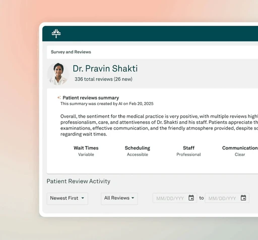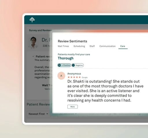 AI Review Insights highlights patterns in patient feedback by theme and tracks sentiment over time.