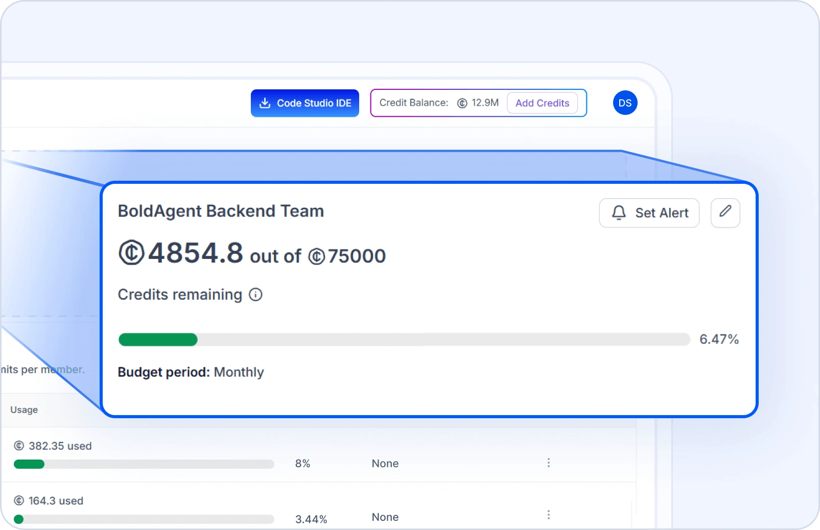 Create budgets for teams and users, receive timely alerts, and view usage trends to manage costs confidently.