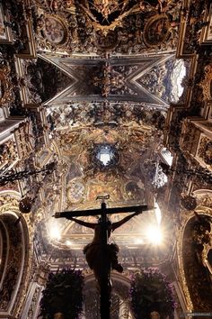 the crucifix is in front of an ornate ceiling