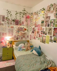 an unmade bed with lots of stuffed animals on the wall and pillows in front of it