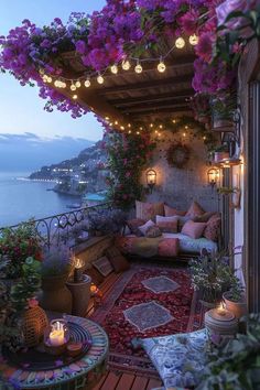an outdoor patio with lots of furniture and flowers on the balcony at night, lit by lanterns