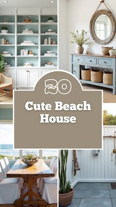 the words cute beach house are in front of pictures of chairs, tables and bookshelves