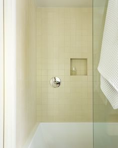 This bathroom focuses on the use of few materials, to create a serene and minimalistic impression. We covered all walls in our glossy tile Sand, and combined it with a uniform red-grey limestone.
