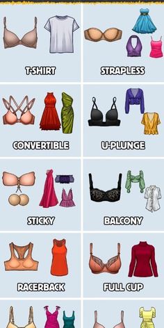Types of bras. Big vector collection of lingerie. Set of underwear, balconette, strapless, unlined, super push-up, soft-cup, longline, sports, demi and triangle bra. Set of isolated icons with bras.