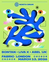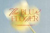 a blue and yellow poster with two flowers on the bottom half of it, in front of a black background
