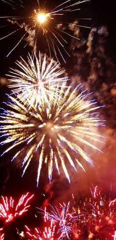 fireworks are lit up in the night sky with many colors and shapes on display,